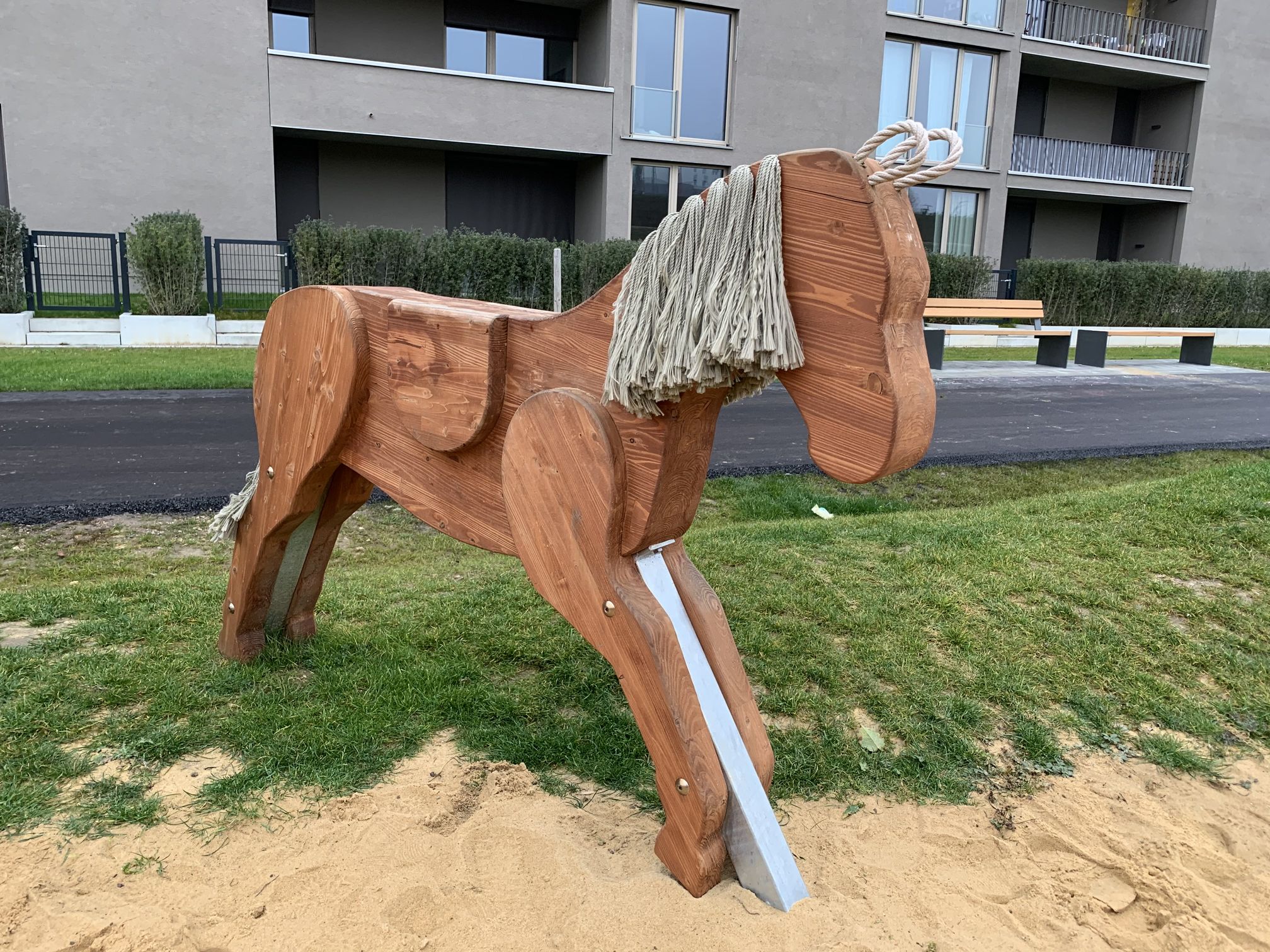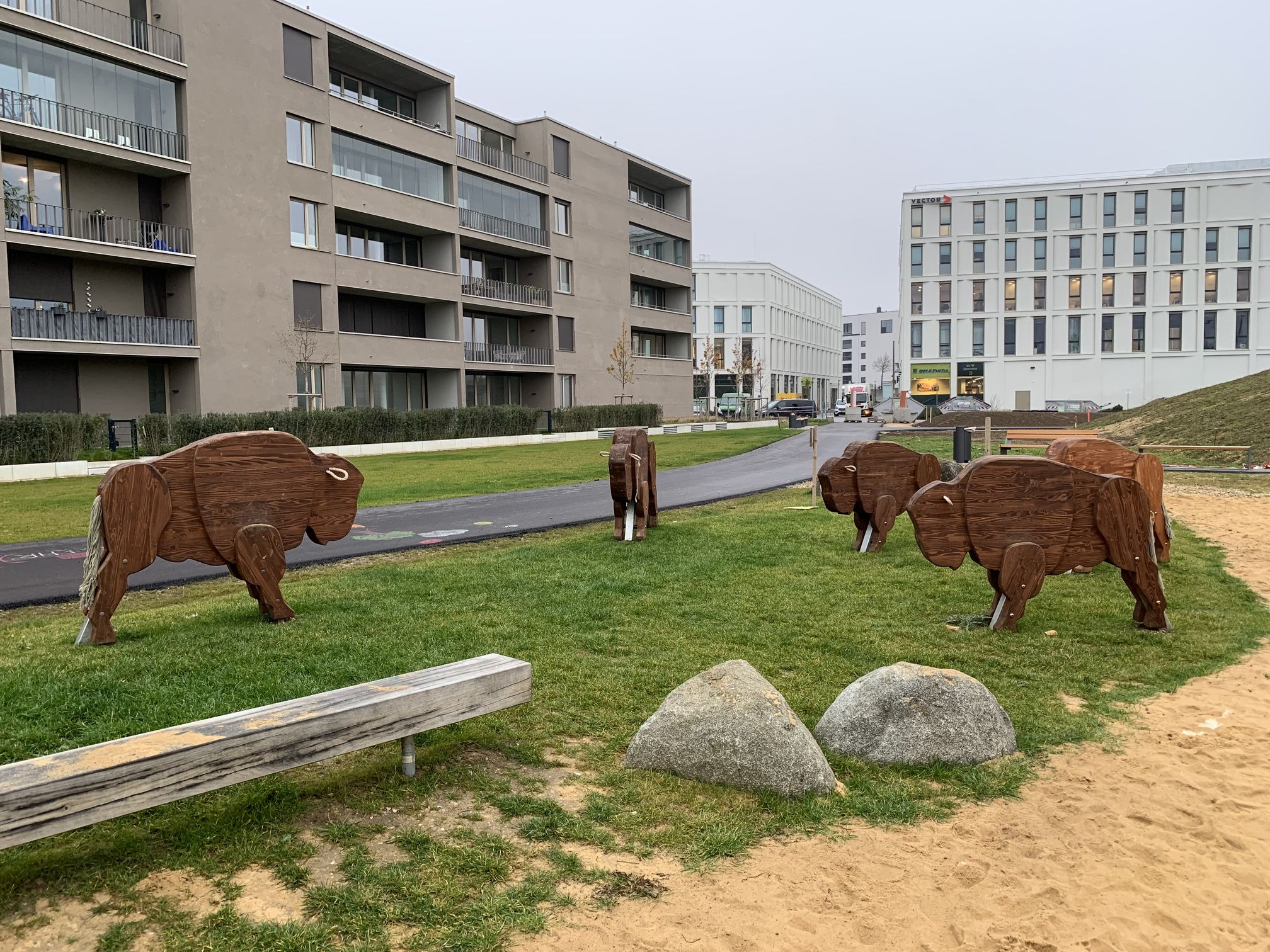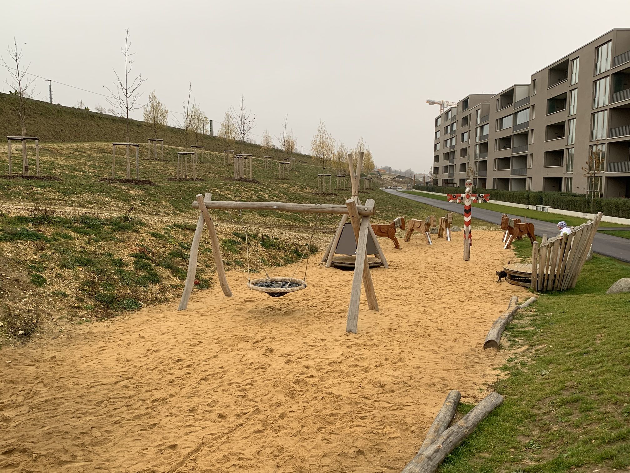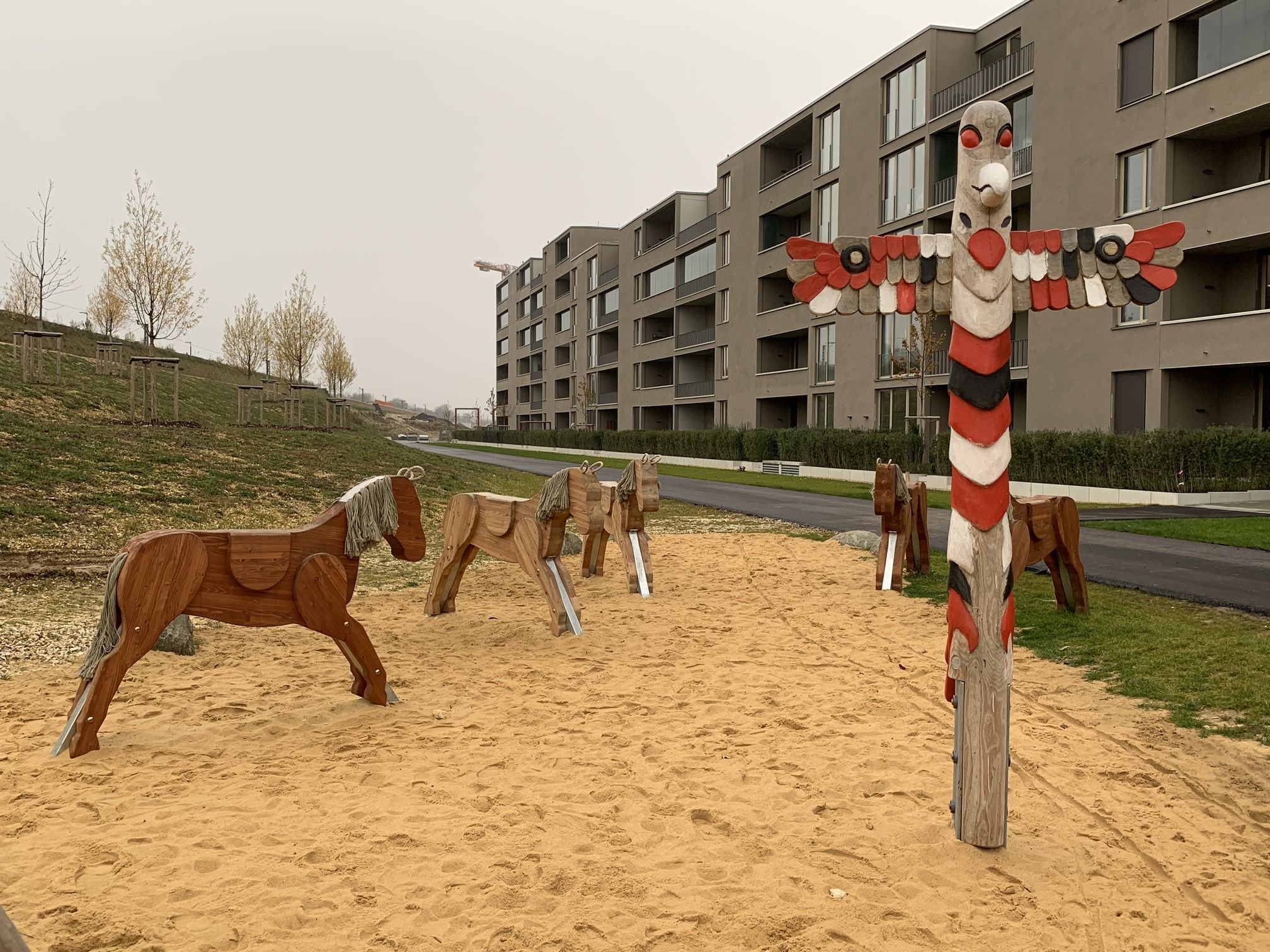 Howdy! Im Dörnberg-Viertel entstanden von 2016 bis 2024 knapp 1400 neue Wohnungen. Im östlichen Teil des Viertels durften wir 2019 den Wild-West-Spielplatz umsetzen. Hier kann man auf Pferden durch die Prärie reiten, auf einem der riesigen, zahmen Bisons die Aussicht genießen, sich im Tipi verstecken oder von der Lore schaukeln lassen. Der Häuptlingsstuhl und Totempfahl runden das Wild-West-Feeling ab. Eine Nestschaukel und Hangrutsche ergänzen das Spielangebot zusätzlich.